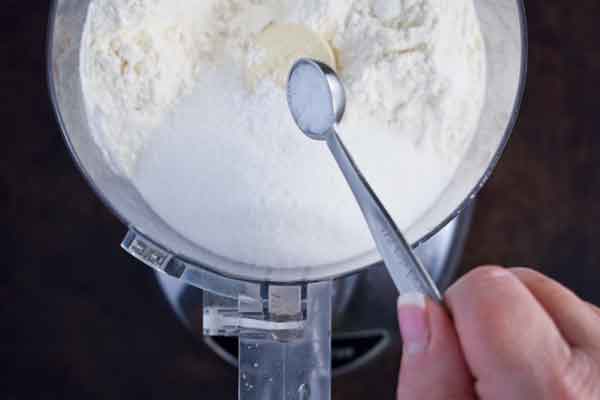 - In the bowl of your Food Processor combine 3 cups all-purpose flour, 1/2 cup sugar, and 1/2 teaspoon salt. With the Food Processor running, feed 1 cup cold, diced butter through the tube until the mixture resembles coarse crumbs.